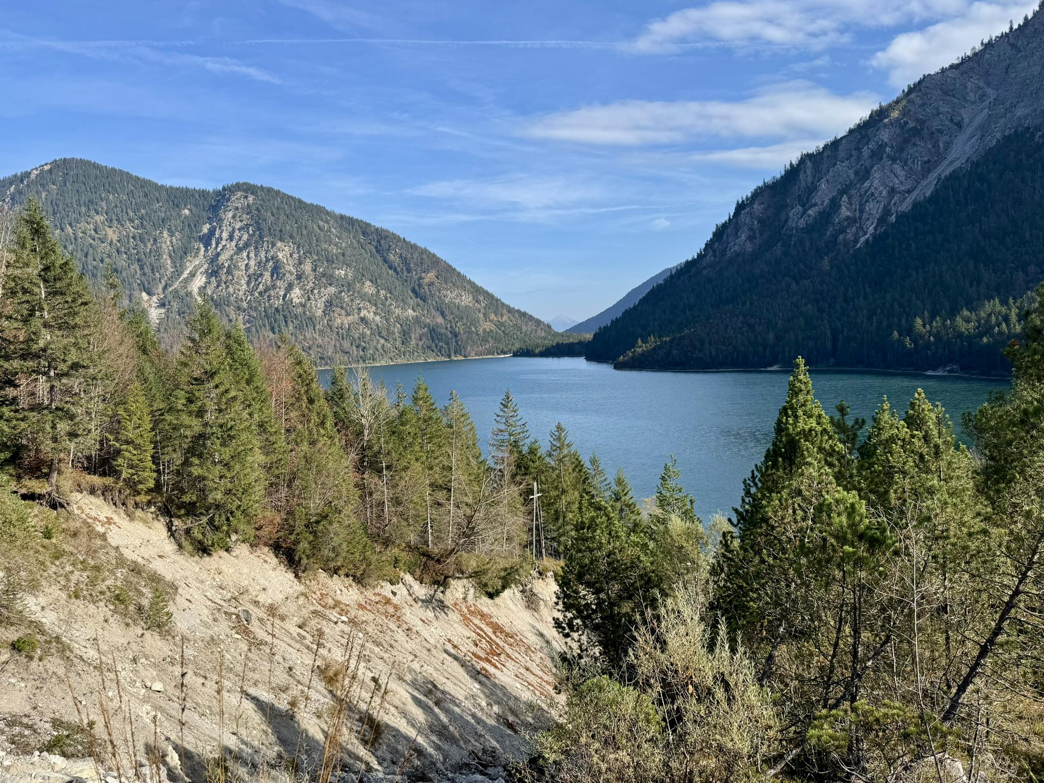 ハイターヴァンガー湖は、透き通ったターコイズブルーの水と、標高約3,200フィート(1,000メートル)に位置していることで知られています。300メートル長の運河でプランゼーとつながっており、チロルで2番目に大きな水域を形成しています。湖は山々と森林に覆われた斜面に囲まれています。