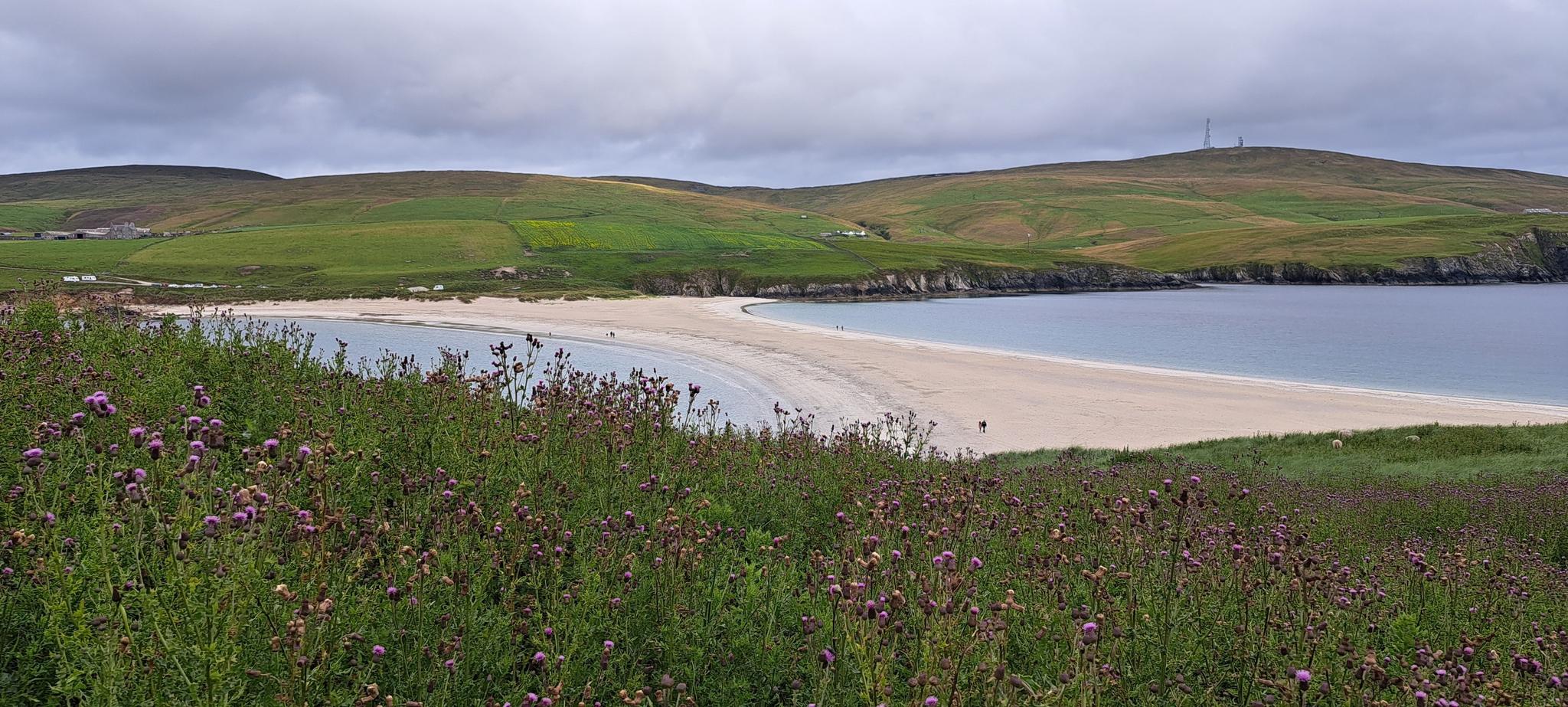 Shetlandには、多様な海岸の景観とユニークな地質学的形成があります。ハイライトには、Eshanessの垂直な火山崖、Hermaness国立自然保護区のそびえ立つ海鳥の崖、St Ninian's Isleのトンボロ、そして最高地点である1,476フィート(450 m)のRonas Hillが含まれます。