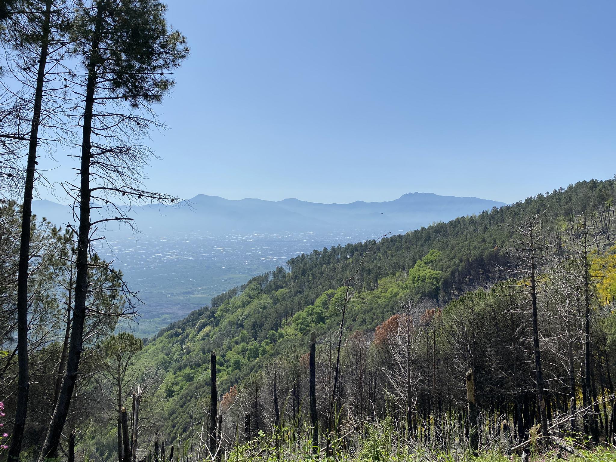 Terzignoはヴェスヴィオ国立公園内に位置しており、独特の火山景観とヴェスヴィオ山の景色が特徴です。トレイル沿いの高台からは、ナポリ湾、ナポリ市、イスキア島、プロチダ島、カプリ島のパノラマビューが楽しめます。この地域には、松林や地中海性低木林など、多様な植物相もあります。