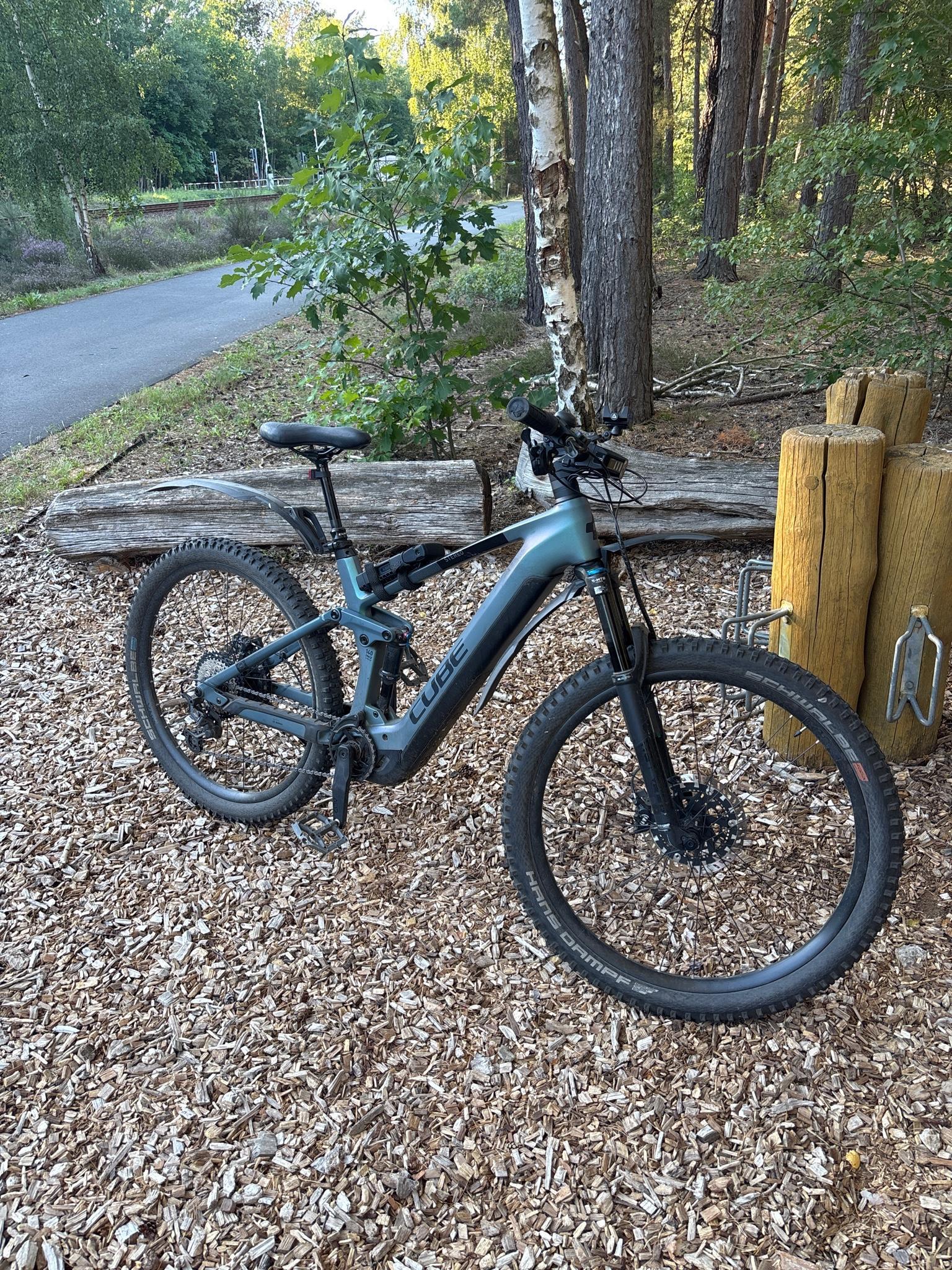 Wide bike path through the forest and terrain. Roots repeatedly lift the asphalt, so caution is advised...