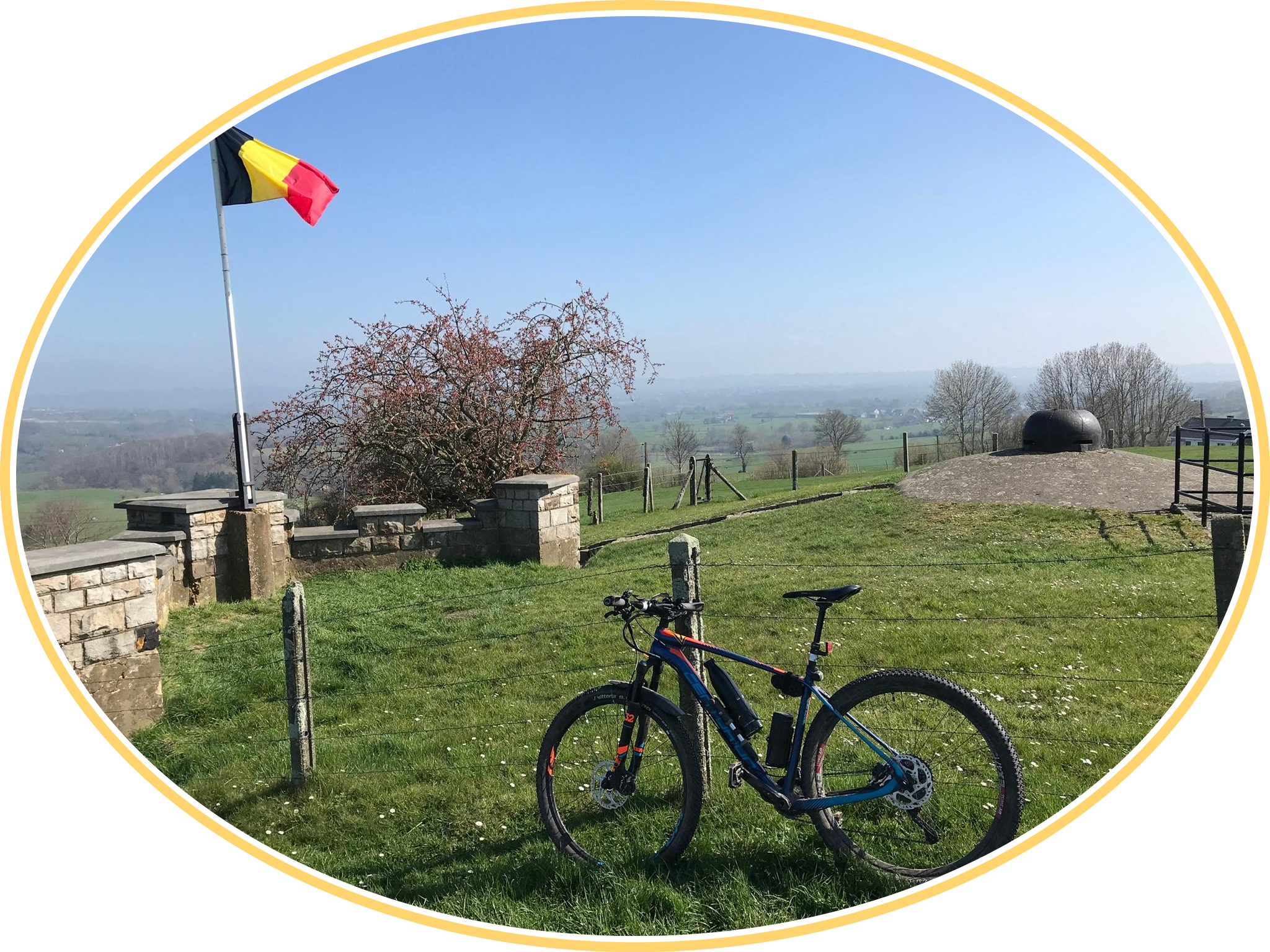 Relatively far outside the villages within the nature park, isolated on the side of the road, the biker encounters a stone-carved statue (or rather, a relief image) of the Virgin Mary, holding her son Jesus on her lap. The divine child, in turn, holds a globe crowned by an oversized cross – a double symbol: The globe signifies Jesus as Lord of the world, while the cross refers to his death, which the Son of God endured out of love for us humans in order to redeem us.
