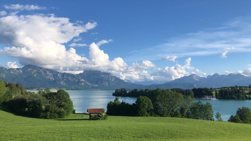 Beautiful view of the Alpine landscape and the Alpsee! There is a view of the magnificent mountain panorama around Schwangau. Impressive and recommended!
