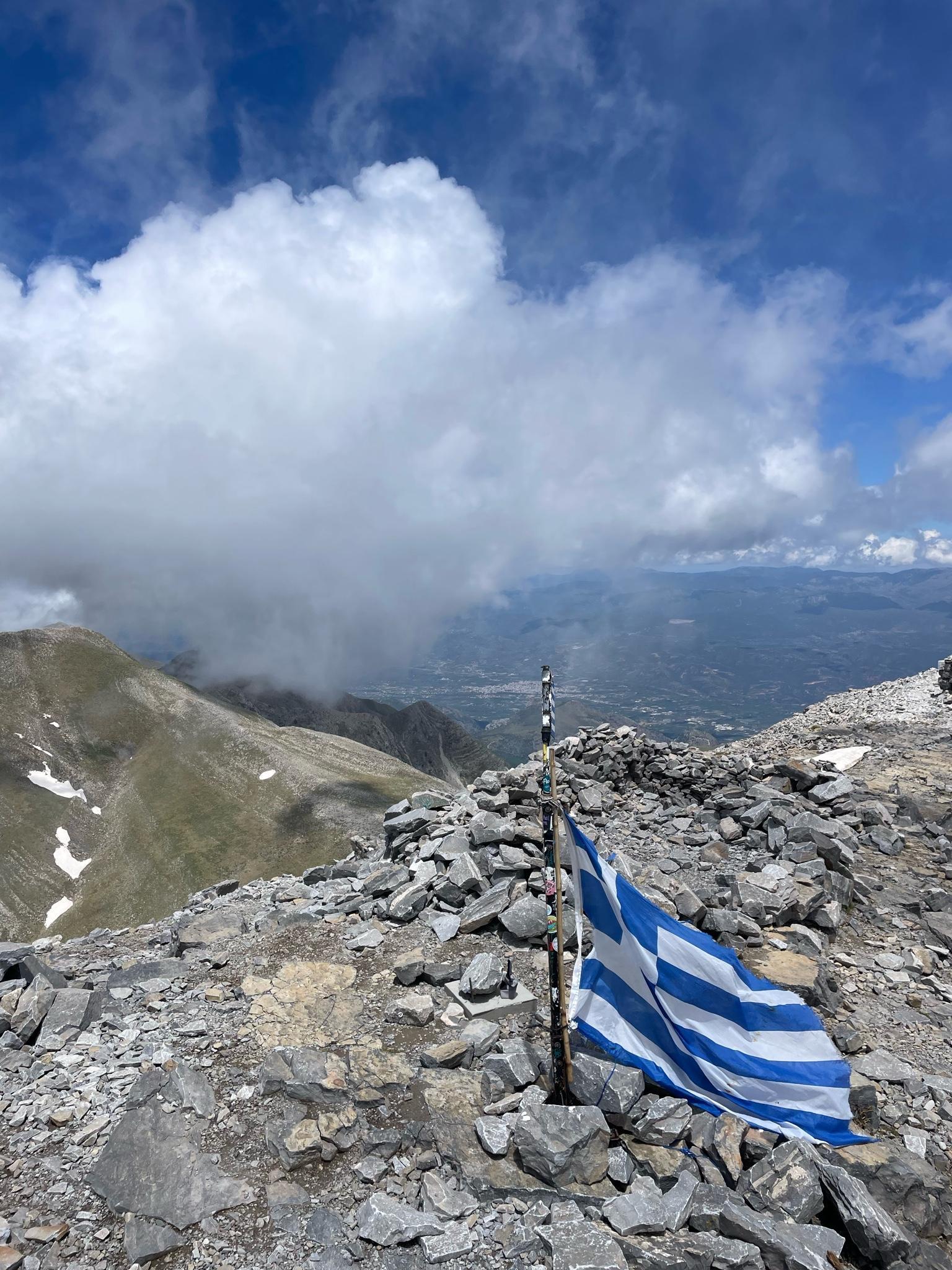 The path is rocky, but well maintained and occasionally marked with E4 poles and trail signs. On the Afchenas saddle, 1,706 m, the E4 and the path to the summit separate. When you reach the stone pyramid, this is only the forepeak. The actual summit can be identified by a metal pole (remains of the summit cross). Snow fields are still to be expected here in May.