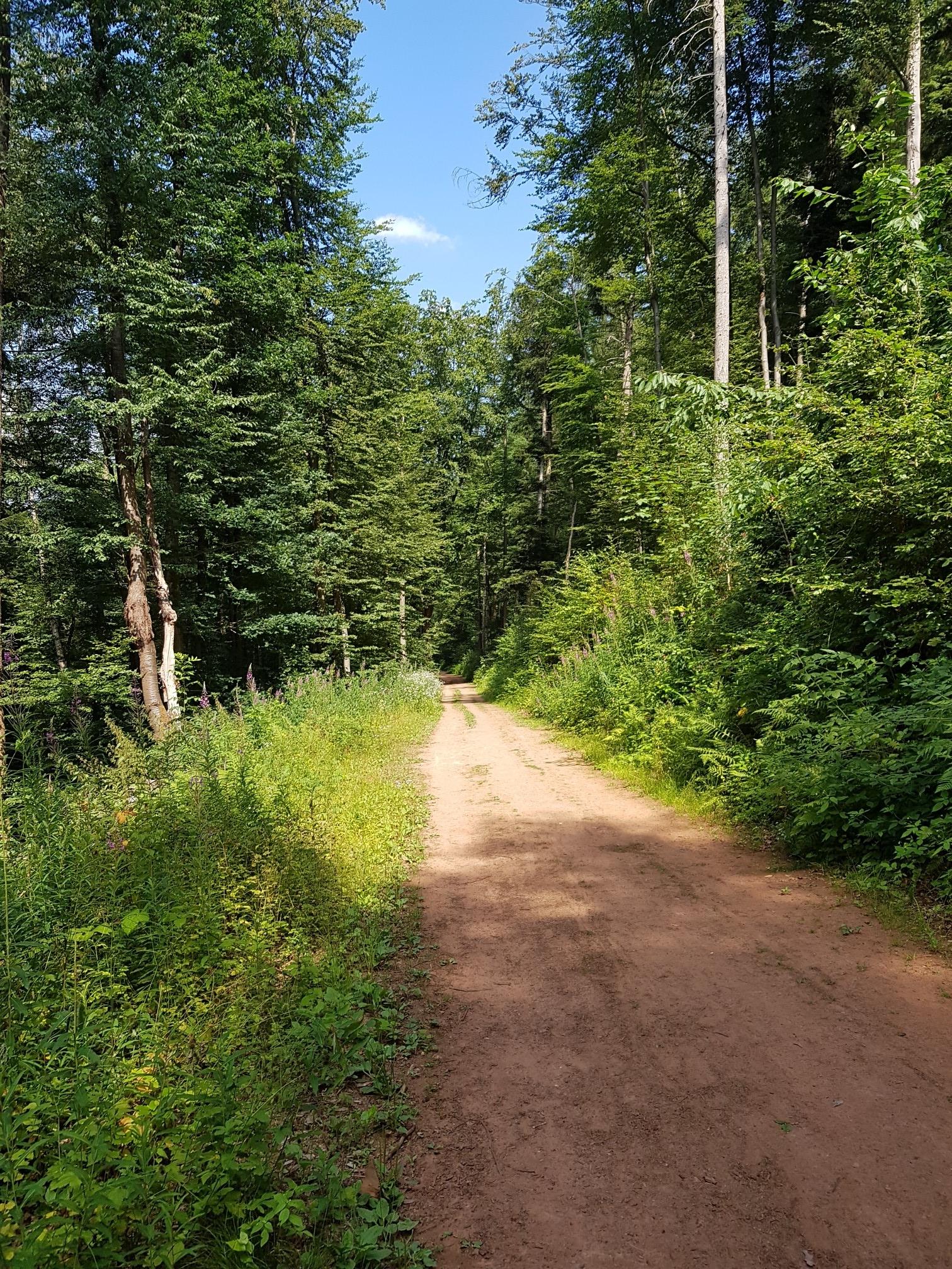 An unpaved path runs along the top of the forest, better for the joints.