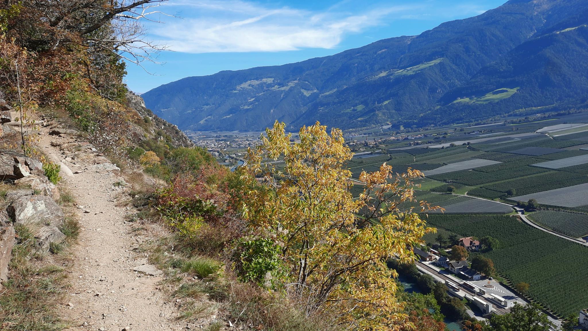 이 지역의 하이킹 코스는 Waalwege로 알려진 역사적인 관개 수로를 따라 걷는 여유로운 산책부터 도전적인 고산 트레킹까지 다양합니다. 길은 과수원, 포도밭, 밤나무 숲, 낙엽송 숲을 가로지릅니다. 이 지역은 텍셀 그룹 자연 공원(Texel Group Nature Park)과 스텔비오 국립 공원(Stelvio National Park) 사이에 위치하여 다양한 풍경을 제공합니다.