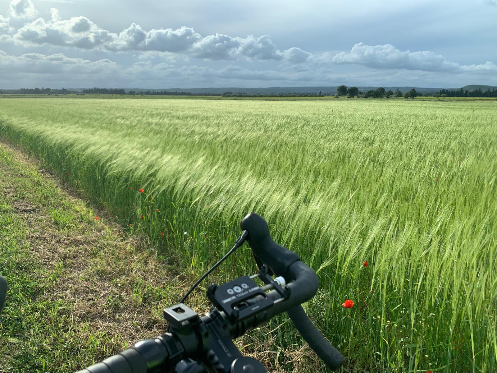Straight line between Meynes and Bezouce. Peaceful, flat, between orchards and vineyards (little/no car).