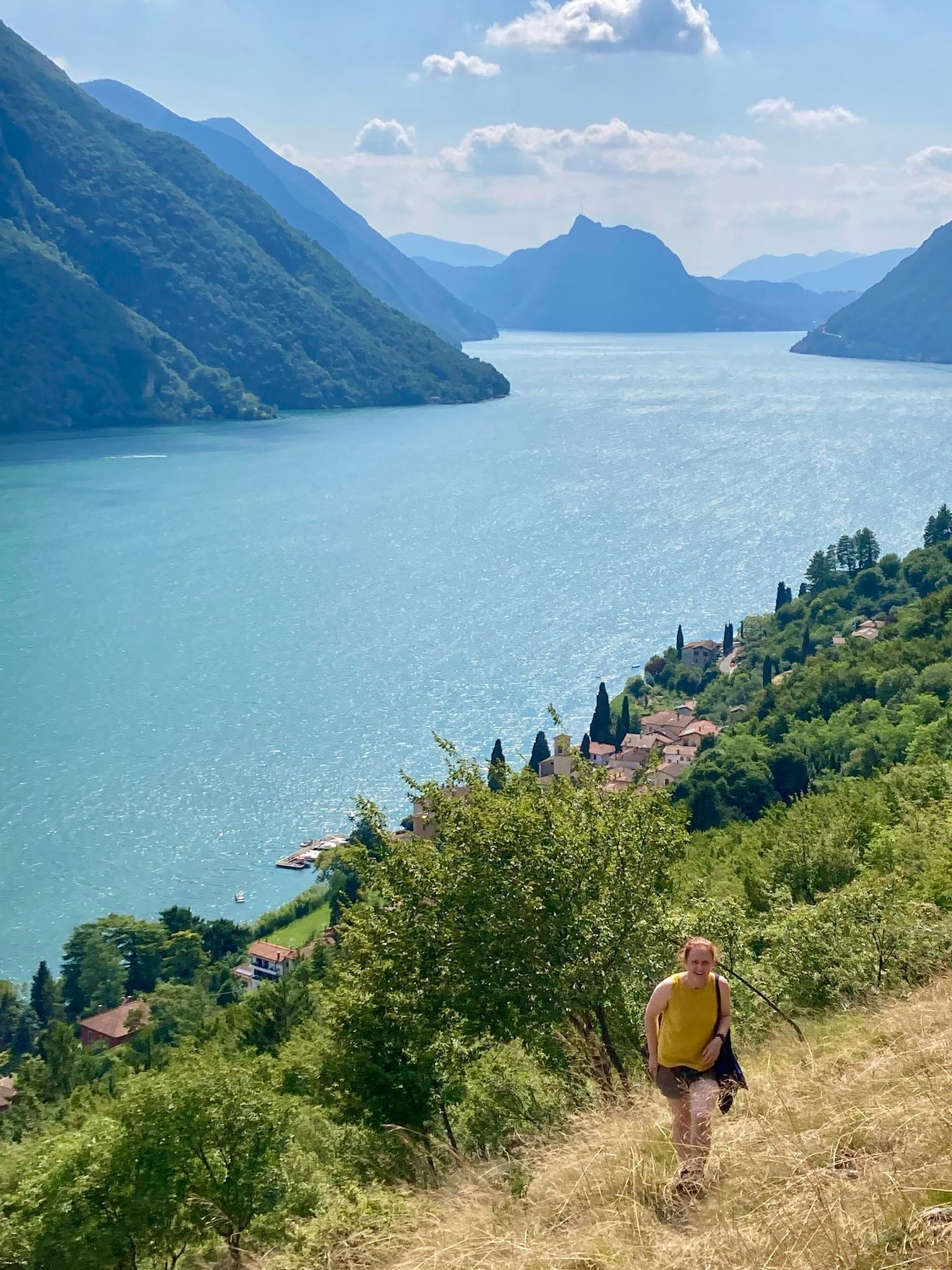 From the summit of Monte Grona, the view extends not only to Lake Como, but also to Lake Lugano and the Lago di Piano in front of it. There are several ways to reach Monte Grona: a via ferrata, a steep path ("Sentiero Direttissima") and an easier panoramic path.