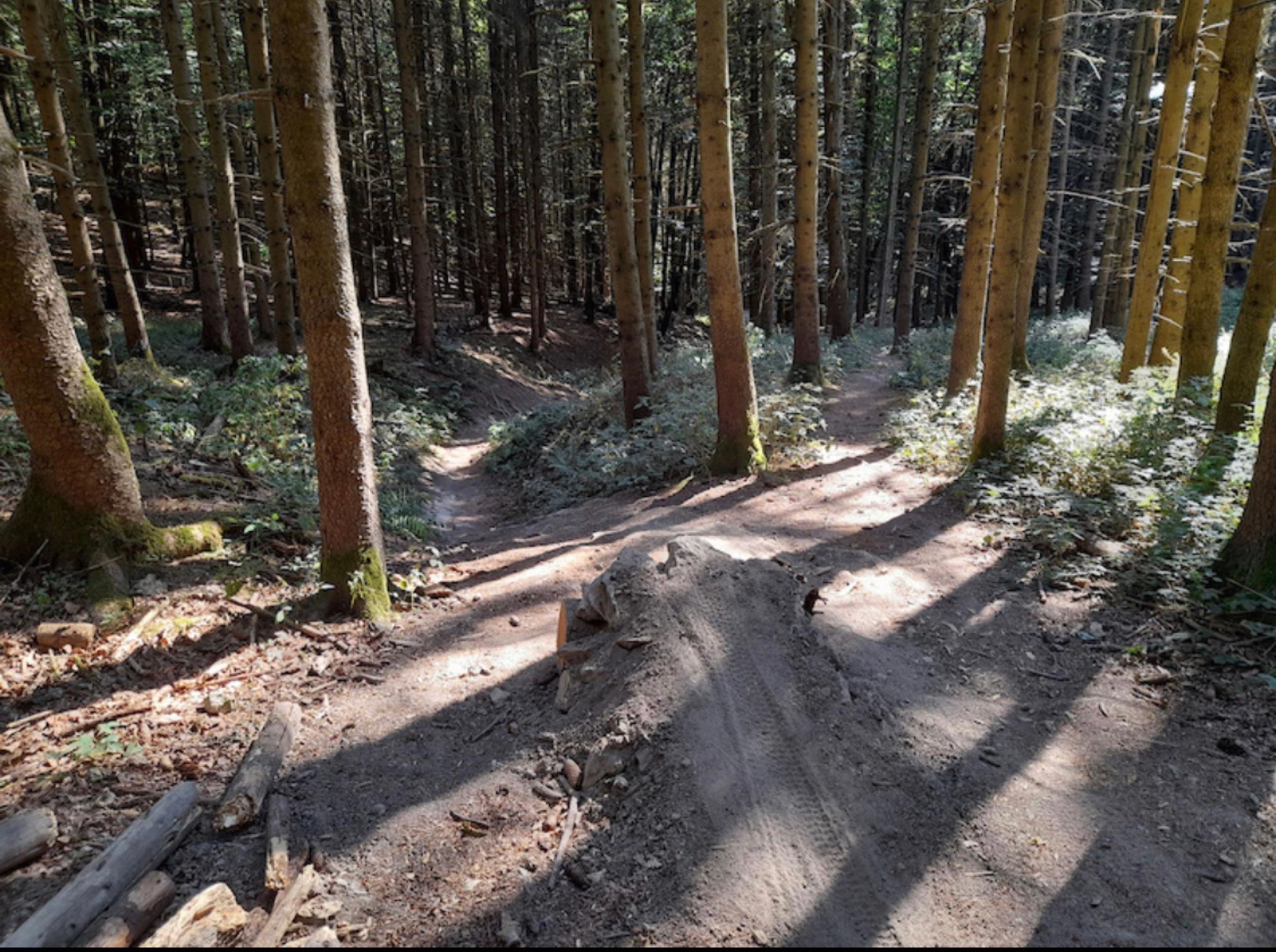 Natural pump track with a small kicker and a ramp.