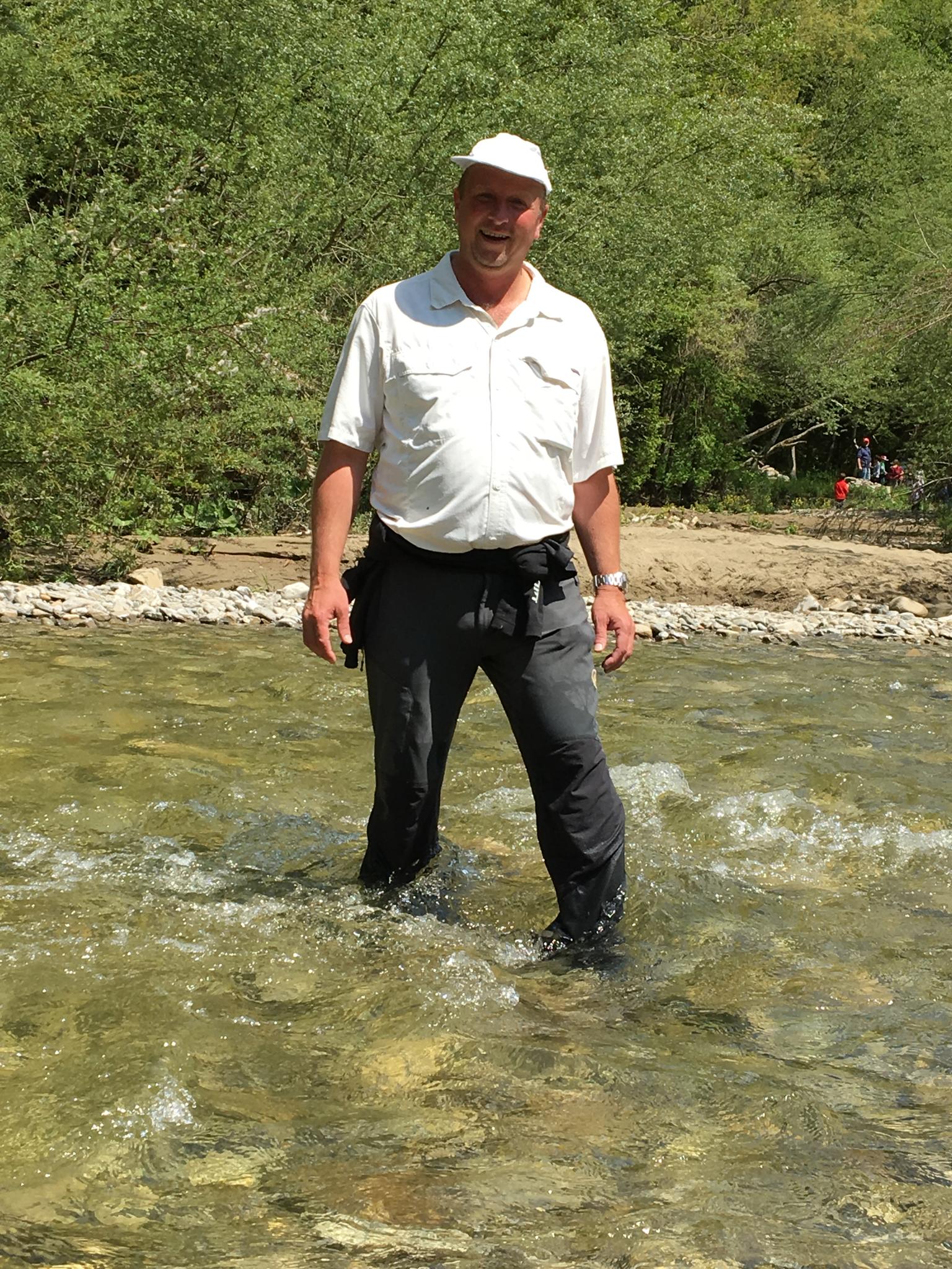 Fantastically located lagoon in the mountains with lush greenery and tadpoles in the water.