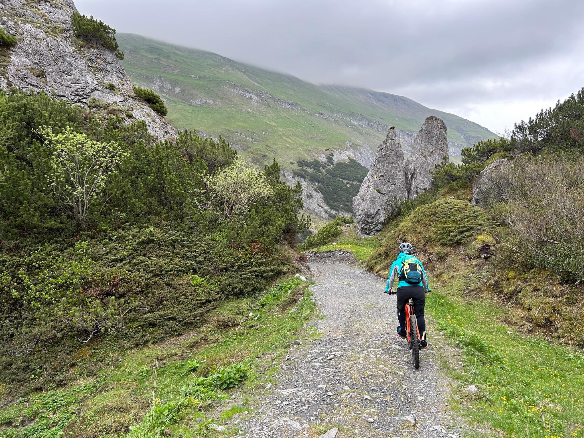 It's not so bad: you can cycle up to 2,300 meters on road and gravel from Morter, but you'll have to push the bike for the last 300 meters. The via ferrata sections are easy; just lift the front wheel a few times. The descent is magnificent.