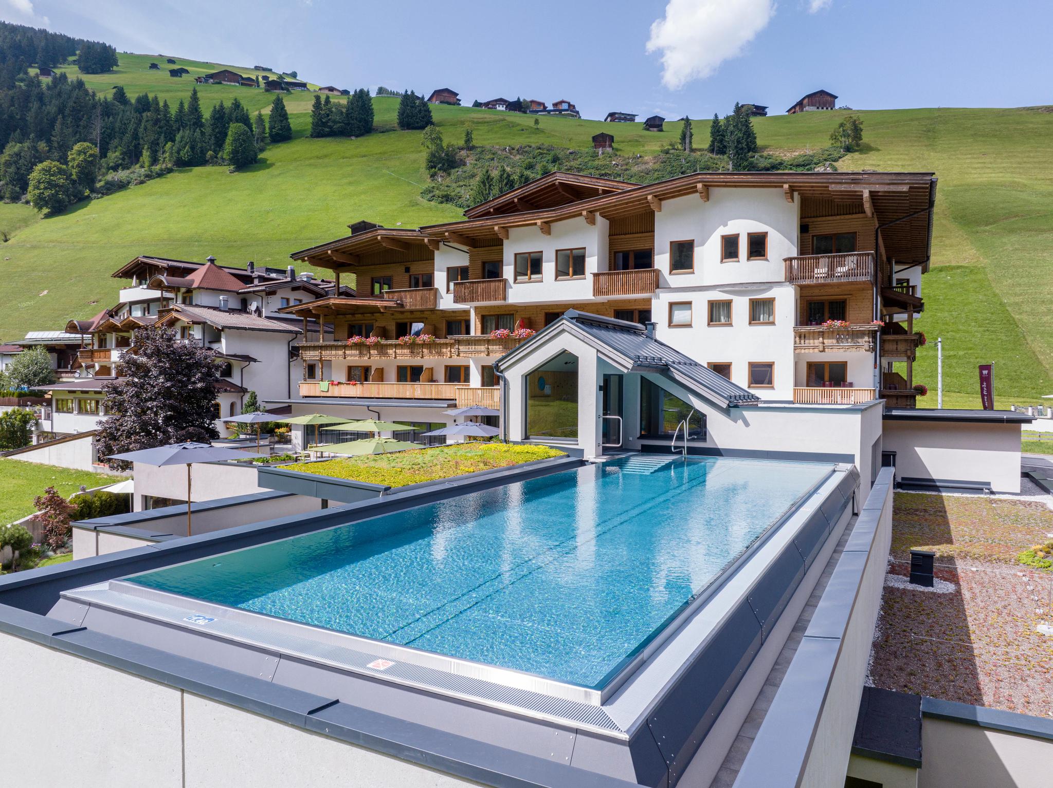 Hiking every day, whatever the weather – because we love it: "Not just seeing the mountains, but feeling them – that's our goal," says Iris, one of our five hiking guides. Two to three tours of varying difficulty levels through the Zillertal Alps are offered daily. Afterwards, you can relax in the infinity pool with panoramic views of the peaks you've just climbed. More information at: https://www.tuxertal.at/.