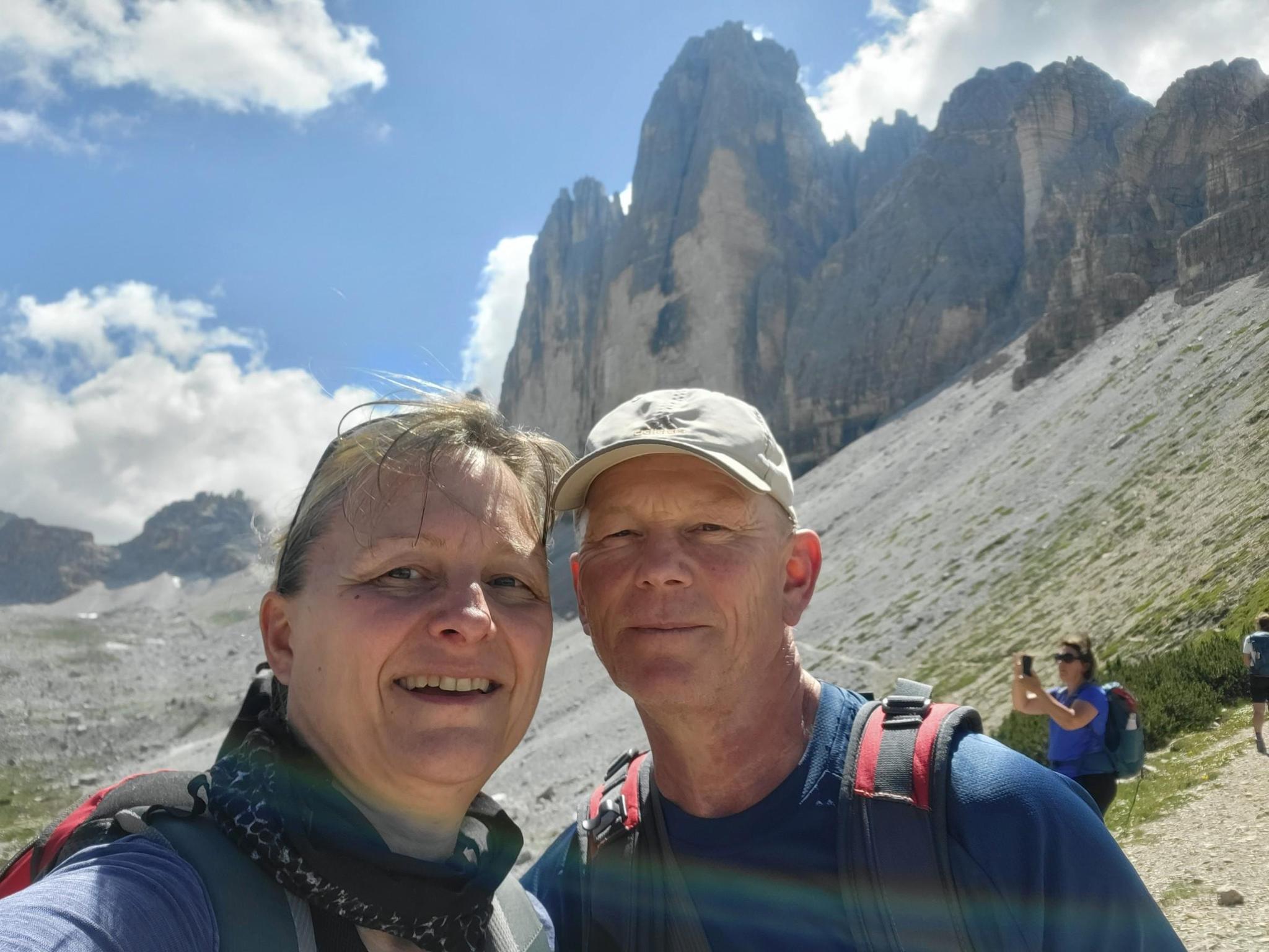 The Three Peaks (Italian: Tre Cime di Lavaredo) are a striking mountain range in the Sesto Dolomites on the border between the Italian provinces of Belluno in the south and South Tyrol in the north. The highest point in the group is 2999 m slm. high Great Peak (Italian: Cima Grande). It stands between the other two peaks, the Western Zinne (Cima Ovest, 2973 m) and the Kleine Zinne (Cima Piccola, 2857 m) Source: Wikipedia